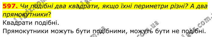597. Чи подібні два квадрати, якщо їхні периметри різні? А два прямокутники? Квадрати подібні. Прямокутники можуть бути подібними, можуть бути не подібні.