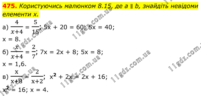 475. Користуючись малюнком 8.15, де а ∥ b, знайдіть невідоми елементи х. а) 4/(x+4) = 5/15; 5x + 20 = 60; 5x = 40; x = 8. б) x/(x+4) = 2/7; 7x = 2x + 8; 5x = 8; x = 1,6. в) x/(x+8) = 2/(x+2); x2 + 2x = 2x + 16; x2 = 16; x = 4.