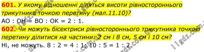 601. У якому відношенні діляться висоти рівностороннього трикутника точкою перетину (мал.11.10)? AO : OH = ВО : ОK = 2 : 1. 602. Чи можуть бісектриси рівностороннього трикутника точкою перетину ділитися на частини: 2 см і 8 см, 5 см і 10 см? Ні, не можуть. 8 : 2 = 4 : 1; 10 : 5 = 1 : 2.
