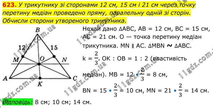 623. У трикутнику зі сторонами 12 см, 15 см і 21 см через точку перетину медіан проведено пряму, паралельну одній зі сторін. Обчисли сторони утвореного трикутника. Нехай дано ∆ABC, AB = 12 см, BC = 15 см, AC = 21 см. O — точка перетину медіан трикутника. MN ∥ AC. ∆MBN ~ ∆ABC. k = 2/3. OK : OB = 1 : 2 (властивість медіан). MB = 12 • 2/3 = 8 см, BN = 15 • 2/3 = 10 см, MN = 21 • 2/3 = 14 см. Відповідь: 8 см; 10 см; 14 см.