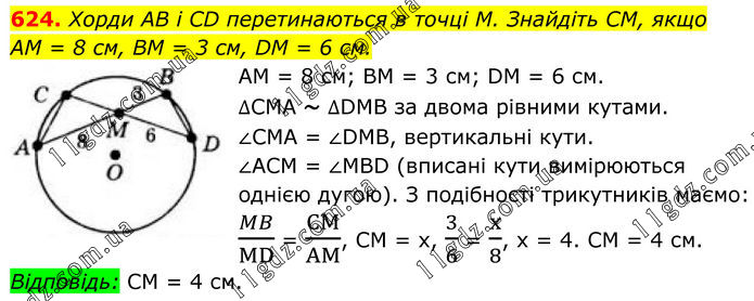 624. Хорди AB і CD перетинаються в точці M. Знайдіть CM, якщо AM = 8 см, BM = 3 см, DM = 6 см. AM = 8 см; BM = 3 см; DM = 6 см. ∆CMA ~ ∆DMB за двома рівними кутами. ∠CMA = ∠DMB, вертикальні кути. ∠ACM = ∠MBD (вписані кути вимірюються однією дугою). З подібності трикутників маємо: MB/MD = CM/AM, CM = x, 3/6 = x/8, x = 4. CM = 4 см. Відповідь: CM = 4 см.