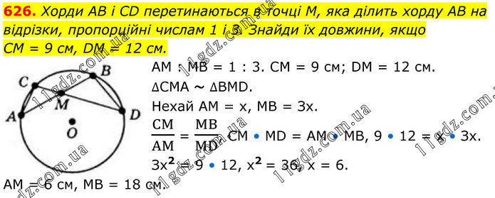 626. Хорди AB і CD перетинаються в точці M, яка ділить хорду AB на відрізки, пропорційні числам 1 і 3. Знайди їх довжини, якщо CM = 9 см, DM = 12 см. AM : MB = 1 : 3. CM = 9 см; DM = 12 см. ∆CMA ~ ∆BMD. Нехай AM = х, MB = Зх. CM/AM = MB/MD, CM • MD = AM • MB, 9 • 12 = х • Зх. Зх2 = 9 • 12, x2 = 36, х = 6. AM = 6 см, MB = 18 см.