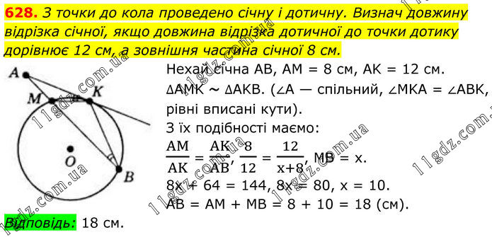 628. З точки до кола проведено січну і дотичну. Визнач довжину відрізка січної, якщо довжина відрізка дотичної до точки дотику дорівнює 12 см, а зовнішня частина січної 8 см. Нехай січна AB, AM = 8 см, AK = 12 см. ∆AMK ~ ∆AKB. (∠A — спільний, ∠MKA = ∠ABK, рівні вписані кути). З їх подібності маємо: AM/AK = AK/AB, 8/12 = 12/(x+8), МВ = х. 8х + 64 = 144, 8х = 80, x = 10. AB = AM + MB = 8 + 10 = 18 (см). Відповідь: 18 см.