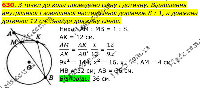 630. З точки до кола проведено січну і дотичну. Відношення внутрішньої і зовнішньої частин січної дорівнює 8 : 1, а довжина дотичної 12 см. Знайди довжину січної. Нехай AM : MB = 1 : 8. AK = 12 см. AM/AK = AK/AB, x/12 = 12/9x, 9x2 = 144, x2 = 16, х = 4. AM = 4 см; MB = 32 см; AB = 36 см. Відповідь: 36 см.