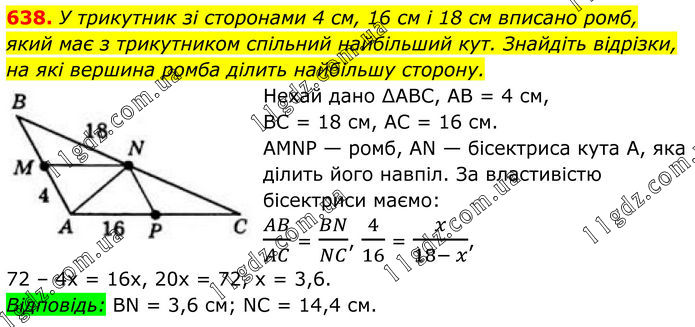 638. У трикутник зі сторонами 4 см, 16 см і 18 см вписано ромб, який має з трикутником спільний найбільший кут. Знайдіть відрізки, на які вершина ромба ділить найбільшу сторону. Нехай дано ∆ABC, AB = 4 см, BC = 18 см, AC = 16 см. AMNP — ромб, AN — бісектриса кута А, яка ділить його навпіл. За властивістю бісектриси маємо: AB/AC = BN/NC, 4/16 = x/(18- x), 72 – 4x = 16x, 20x = 72, x = 3,6. Відповідь: BN = 3,6 см; NC = 14,4 см.