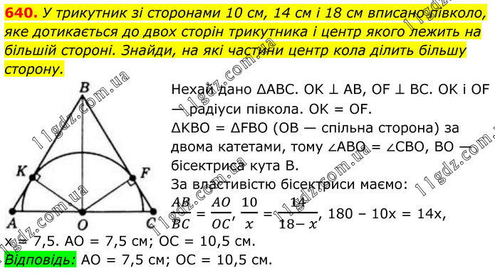640. У трикутник зі сторонами 10 см, 14 см і 18 см вписано півколо, яке дотикається до двох сторін трикутника і центр якого лежить на більшій стороні. Знайди, на які частини центр кола ділить більшу сторону. Нехай дано ∆ABC. OK ⊥ AB, OF ⊥ BC. OK і OF — радіуси півкола. OK = OF. ∆KBO = ∆FBO (OB — спільна сторона) за двома катетами, тому ∠ABO = ∠CBO, BO — бісектриса кута В. За властивістю бісектриси маємо: AB/BC = AO/OC, 10/x = 14/(18- x), 180 – 10x = 14x, x = 7,5. AO = 7,5 cм; OC = 10,5 см. Відповідь: AO = 7,5 см; OC = 10,5 см.