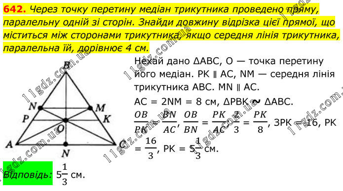 642. Через точку перетину медіан трикутника проведено пряму, паралельну одній зі сторін. Знайди довжину відрізка цієї прямої, що міститься між сторонами трикутника, якщо середня лінія трикутника, паралельна їй, дорівнює 4 см. Нехай дано ∆ABC, O — точка перетину його медіан. PK ∥ AC, NM — середня лінія трикутника ABC. MN ∥ AC. AC = 2NM = 8 см, ∆PBK ~ ∆ABC. OB/PK = BN/AC, OB/BN = PK/AC; 2/3 = PK/8, ЗРК = 16, PK = 16/3, PK = 51/3 см. Відповідь: 51/3 см.