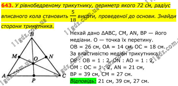 643. У рівнобедреному трикутнику, периметр якого 72 см, радіус вписаного кола становить 5/18 висоти, проведеної до основи. Знайди сторони трикутника. Нехай дано ∆ABC, CM, AN, BP — його медіани. O — точка їх перетину. OB = 26 см, OA = 14 см, OC = 18 см. За властивістю медіан трикутника: ОР : ОВ = 1 : 2, ON : AO = 1 : 2, OM : OC = 1 : 2, AN = 21 см, BP = 39 см, CM = 27 см. Відповідь: 21 см, 39 см, 27 см.