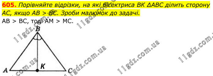 605. Порівняйте відрізки, на які бісектриса BК ∆ABC ділить сторону AC, якщо AB > BC. Зроби малюнок до задачі. AB > BC, тоді AM > MC.