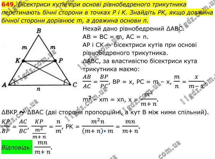 649. Бісектриси кутів при основі рівнобедреного трикутника перетинають бічні сторони в точках P і K. Знайдіть PK, якщо довжина бічної сторони дорівнює m, а довжина основи n. Нехай дано рівнобедрений ∆ABC. AB = BC = m, AC = n. AP і CK — бісектриси кутів при основі рівнобедреного трикутника. ∆ABC, за властивістю бісектриси кута трикутника маємо: AB/AC = BP/PC, BP = x, PC = m – х, m/n = x/(m- x), m2 – хm = хn, х = m^2/(m+ n). ∆BKP ~ ∆BAC (дві сторони пропорційні, а кут В між ними спільний). KP/BP = AC/BC, KP/(m^2/(m+ n)) = n/m, PK = (m^2 n)/((m+ n)• m) = mn/(m+ n). Відповідь: mn/(m+ n).