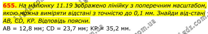 655. На малюнку 11.19 зображено лінійку з поперечним масштабом, якою можна виміряти відстані з точністю до 0,1 мм. Знайди відстані АВ, СD, КР. Відповідь поясни. AB = 12,8 мм; CD = 23,7 мм; KP = 35,2 мм.