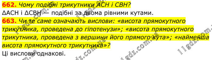 662. Чому подібні трикутники ACH і CBH? ∆АСH і ∆СВH — подібні за двома рівними кутами. 663. Чи те саме означають вислови: «висота прямокутного трикутника, проведена до гіпотенузи»; «висота прямокутного трикутника, проведена з вершини його прямого кута»; «найменша висота прямокутного трикутника»? Ці вислови однакові.
