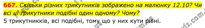 667. Скільки різних трикутників зображено на малюнку 12.10? Чи всі ці трикутники подібні один одному? Чому? 5 трикутникків, всі подібні, тому що у них кути рівні.