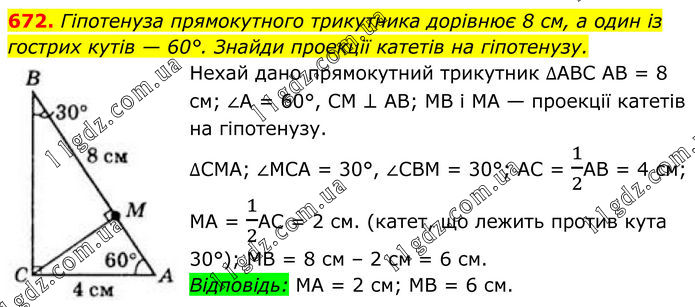 672. Гіпотенуза прямокутного трикутника дорівнює 8 см, а один із гострих кутів — 60°. Знайди проекції катетів на гіпотенузу. Нехай дано прямокутний трикутник ∆ABC, AB = 8 см; ∠A = 60°, СМ ⊥ АВ; MB і MA — проекції катетів на гіпотенузу. ∆CMA; ∠MCA = 30°, ∠CBM = 30°; AC = 1/2AB = 4 см; МА = 1/2АС = 2 см. (катет, що лежить против кута 30°); MB = 8 см – 2 см = 6 см. Відповідь: MA = 2 см; MB = 6 см.