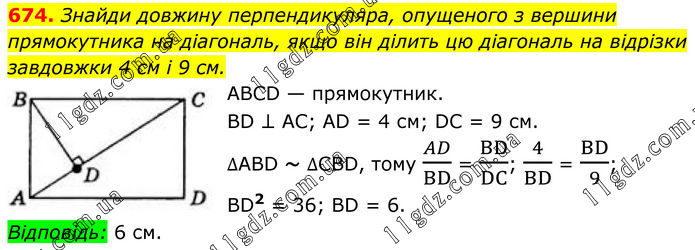 674. Знайди довжину перпендикуляра, опущеного з вершини прямокутника на діагональ, якщо він ділить цю діагональ на відрізки завдовжки 4 см і 9 см. ABCD — прямокутник. BD ⊥ AC; AD = 4 см; DC = 9 см. ∆ABD ~ ∆CBD, тому AD/BD = BD/DC; 4/BD = BD/9; BD2 = 36; BD = 6. Відповідь: 6 см.