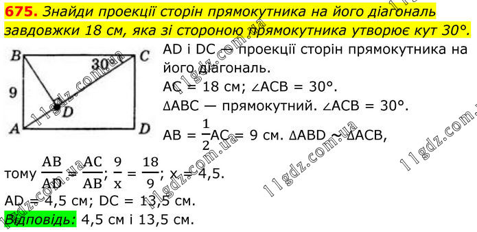 675. Знайди проекції сторін прямокутника на його діагональ завдовжки 18 см, яка зі стороною прямокутника утворює кут 30°. AD і DC — проекції сторін прямокутника на його діагональ. AC = 18 см; ∠ACB = 30°. ∆ABC — прямокутний. ∠ACB = 30°. АB = 1/2АС = 9 см. ∆ABD ~ ∆ACB, тому AB/AD = AC/AB; 9/x = 18/9; х = 4,5. AD = 4,5 см; DC = 13,5 см. Відповідь: 4,5 см і 13,5 см.