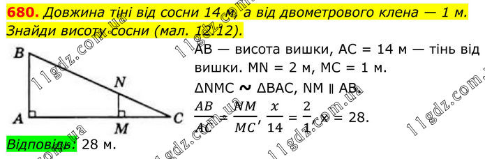 680. Довжина тіні від сосни 14 м, а від двометрового клена — 1 м. Знайди висоту сосни (мал. 12.12). AB — висота вишки, AC = 14 м — тінь від вишки. MN = 2 м, MC = 1 м. ∆NМС ~ ∆ВАС, NM ∥ AB. AB/AC = NM/MC, x/14 = 2/1, x = 28. Відповідь: 28 м.