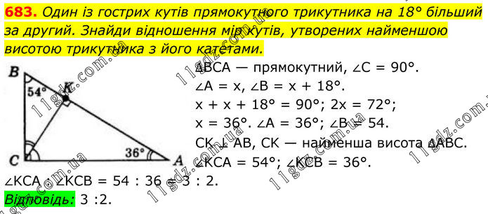 683. Один із гострих кутів прямокутного трикутника на 18° більший за другий. Знайди відношення мір кутів, утворених найменшою висотою трикутника з його катетами. ∆BCA — прямокутний, ∠C = 90°. ∠A = x, ∠B = x + 18°. x + x + 18° = 90°; 2х = 72°; х = 36°. ∠A = 36°; ∠B = 54. CK ⊥ AB, CK — найменша висота ∆АВС. ∠KCA = 54°; ∠KCB = 36°. ∠KСА : ∠KCB = 54 : 36 = 3 : 2. Відповідь: 3 : 2.