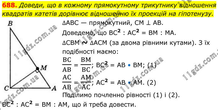 688. Доведи, що в кожному прямокутному трикутнику відношення квадратів катетів дорівнює відношенню їх проекцій на гіпотенузу. ∆АВС — прямокутний, CM ⊥ AB. Доведемо, що BC2 : AC2 = BM : MA. ∆CBM ~ ∆ACM (за двома рівними кутами). З їх подібності маємо: BC/AB = BM/BC; BC2 = AB • BM; (1) AC/AB = AM/AC; AC2 = AB • AM. (2) Поділимо почленно рівності (1) і (2). BC2 : AC2 = BM : АМ, що й треба довести.