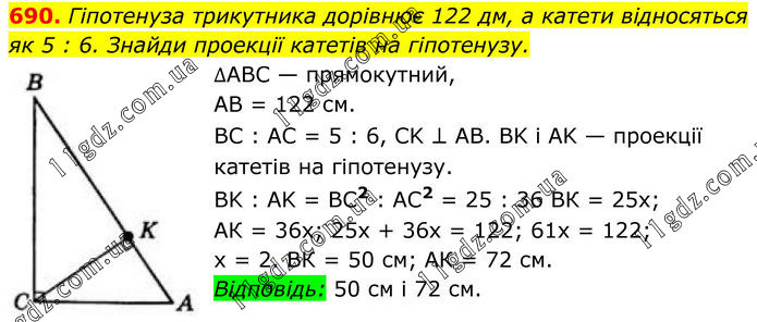690. Гіпотенуза трикутника дорівнює 122 дм, а катети відносяться як 5 : 6. Знайди проекції катетів на гіпотенузу. ∆ABC — прямокутний, AB = 122 см. BC : AC = 5 : 6, CK ⊥ AB. BK і AK — проекції катетів на гіпотенузу. BK : AK = BC2 : AC2 = 25 : 36; ВК = 25х; АК = 36х; 25х + 36х = 122; 61х = 122; х = 2. ВК = 50 cм; AК = 72 см. Відповідь: 50 см і 72 см.