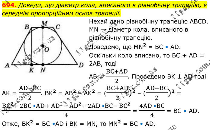 694. Доведи, що діаметр кола, вписаного в рівнобічну трапецію, є середнім пропорційним основ трапеції. Нехай дано рівнобічну трапецію ABCD. MN — діаметр кола, вписаного в рівнобічну трапецію. Доведемо, що MN2 = BC • AD. Оскільки коло вписано, то BC + AD = 2АВ, тоді AB = (BC+AD)/2. Проведемо BK ⊥ AD тоді AK = (AD-BC)/2. BK2 = AB2 – AK2 = ((BC+AD)/2)2 – ((AD-BC)/2)2 = (BC^2+ 2BC •AD+ AD^2- AD^2+ 2AD •BC- BC^2)/4 = (4AD •BC)/4 = BC • AD. Отже, BK2 = BC •AD і BK = MN, то MN2 = BC • AD.