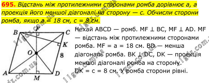 695. Відстань між протилежними сторонами ромба дорівнює a, а проекція його меншої діагоналі на сторону — c. Обчисли сторони ромба, якщо a = 18 см, c = 8 см. Нехай ABCD — ромб. MF ⊥ BC, MF ⊥ AD. MF — відстань між протилежними сторонами ромба. MF = а = 18 см. BD — менша діагональ ромба. BK ⊥ DC, DK — проекція меншої діагоналі ромба на сторону. DK = с = 8 см. У ромба сторони рівні.