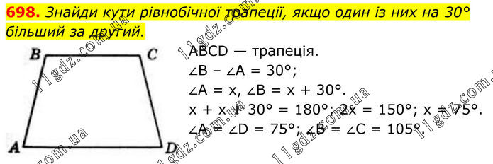 698. Знайди кути рівнобічної трапеції, якщо один із них на 30° більший за другий. ABCD — трапеція. ∠B – ∠A = 30°; ∠A = x, ∠B = x + 30°. х + х + 30° = 180°; 2х = 150°; х = 75°. ∠A = ∠D = 75°; ∠B = ∠C = 105°.