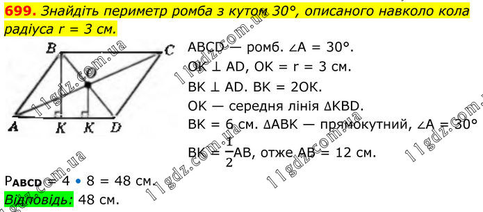 699. Знайдіть периметр ромба з кутом 30°, описаного навколо кола радіуса r = 3 см. ABCD — ромб. ∠A = 30°. OK ⊥ AD, OK = r = 3 см. BK ⊥ AD. BK = 2OК. OK — середня лінія ∆KBD. BK = 6 см. ∆ABK — прямокутний, ∠A = 30°; BK = 1/2АВ, отже АВ = 12 см. PABCD = 4 • 8 = 48 см. Відповідь: 48 см.