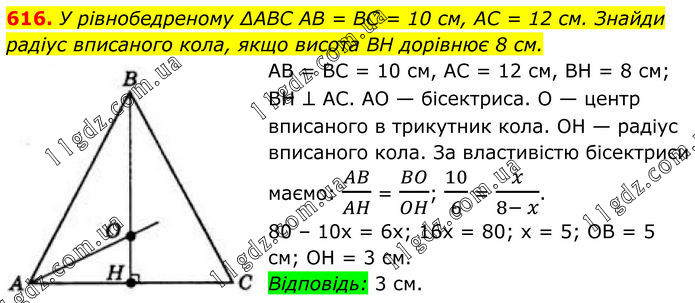 616. У рівнобедреному ∆ABC AB = BC = 10 см, AC = 12 см. Знайди радіус вписаного кола, якщо висота BH дорівнює 8 см. AB = BC = 10 см, AC = 12 см, BH = 8 см; BH ⊥ AC. AO — бісектриса. O — центр вписаного в трикутник кола. OH — радіус вписаного кола. За властивістю бісектриси маємо: AB/AH = BO/OH; 10/6 = x/(8- x). 80 – 10х = 6х; 16х = 80; х = 5; OB = 5 см; OH = 3 см. Відповідь: 3 см.