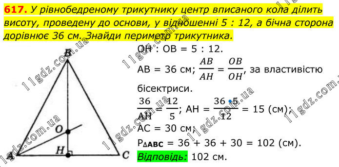 617. У рівнобедреному трикутнику центр вписаного кола ділить висоту, проведену до основи, у відношенні 5 : 12, а бічна сторона дорівнює 36 см. Знайди периметр трикутника. OH : ОВ = 5 : 12. AB = 36 см; AB/AH = OB/OH, за властивістю бісектриси. 36/AH = 12/5; AH = (36 •5)/12 = 15 (cм); AC = 30 см; P∆ABC = 36 + 36 + 30 = 102 (см). Відповідь: 102 см.