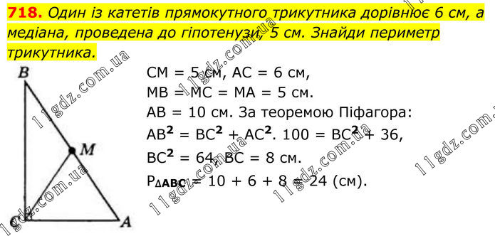 718. Один із катетів прямокутного трикутника дорівнює 6 см, а медіана, проведена до гіпотенузи, 5 см. Знайди периметр трикутника. CM = 5 см, AC = 6 см, MB = MC = MA = 5 см. AB = 10 см. За теоремою Піфагора: AB2 = BC2 + AC2. 100 = BC2 + 36, BC2 = 64, BC = 8 см. P∆ABC = 10 + 6 + 8 = 24 (см).