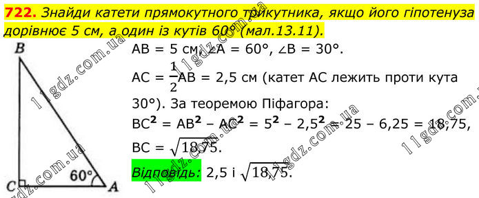 722. Знайди катети прямокутного трикутника, якщо його гіпотенуза дорівнює 5 см, а один із кутів 60° (мал.13.11). AB = 5 см, ∠A = 60°, ∠B = 30°. AC = 1/2АВ = 2,5 cм (катет AC лежить проти кута 30°). За теоремою Піфагора: BC2 = AB2 – AC2 = 52 – 2,52 = 25 – 6,25 = 18,75, BC = √18,75. Відповідь: 2,5 і √18,75.