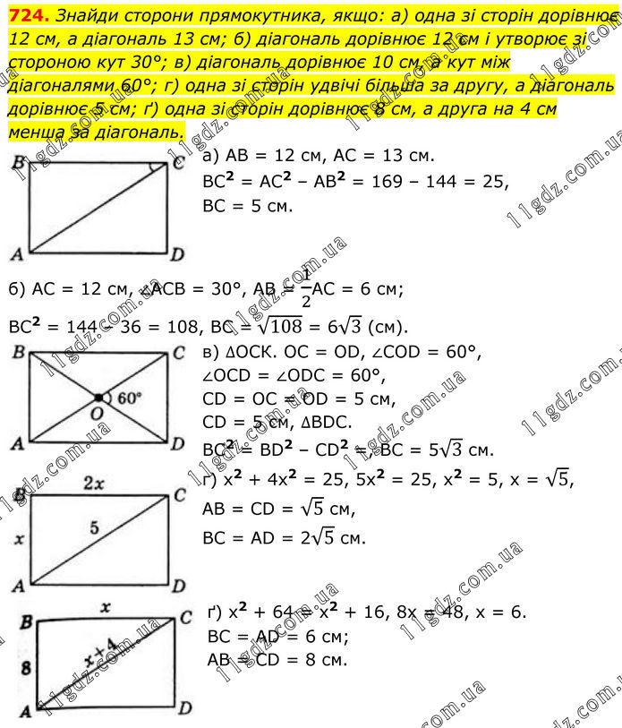 724. Знайди сторони прямокутника, якщо: а) одна зі сторін дорівнює 12 см, а діагональ 13 см; б) діагональ дорівнює 12 см і утворює зі стороною кут 30°; в) діагональ дорівнює 10 см, а кут між діагоналями 60°; г) одна зі сторін удвічі більша за другу, а діагональ дорівнює 5 см; ґ) одна зі сторін дорівнює 8 см, а друга на 4 см менша за діагональ. а) AB = 12 см, AC = 13 см. BC2 = AC2 – AB2 = 169 – 144 = 25, BC = 5 см. б) AC = 12 см, ∠ACB = 30°, AB = 1/2АС = 6 см; BC2 = 144 – 36 = 108, BC = √108 = 6√3 (см). в) ∆ОСК. OC = OD, ∠COD = 60°, ∠OCD = ∠ODC = 60°, CD = OC = OD = 5 см, CD = 5 см, ∆BDC. BC2 = BD2 – CD2 = √(100-25) = √75, BC = 5√3 см. г) x2 + 4x2 = 25, 5х2 = 25, х2 = 5, х = √5, AB = CD = √5 см, BC = AD = 2√5 см. ґ) x2 + 64 = x2 + 16, 8x = 48, х = 6. BC = AD = 6 см; AB = CD = 8 см.