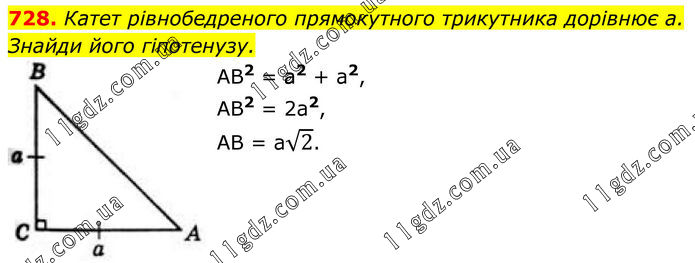 728. Катет рівнобедреного прямокутного трикутника дорівнює a. Знайди його гіпотенузу. AB2 = а2 + а2, AB2 = 2а2, АВ = а√2.