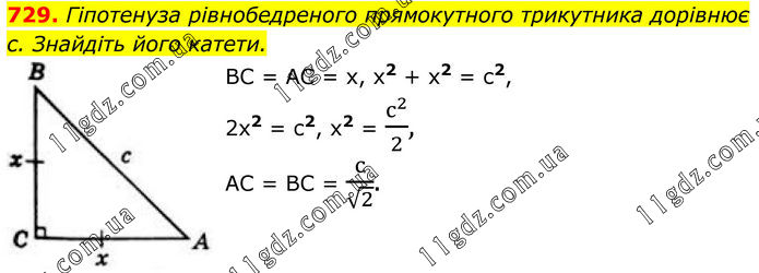 729. Гіпотенуза рівнобедреного прямокутного трикутника дорівнює c. Знайдіть його катети. BC = AC = x, x2 + x2 = c2, 2x2 = c2, x2 = c^2/2, AC = BC = c/√2.