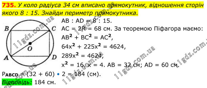 735. У коло радіуса 34 см вписано прямокутник, відношення сторін якого 8 : 15. Знайди периметр прямокутника. AB : AD = 8 : 15. AС = 2R = 68 см. За теоремою Піфагора маємо: AB2 + BC2 = AC2, 64x2 + 225x2 = 4624, 289х2 = 4624, x2 = 16, x = 4. AB = 32 см; AD = 60 см. PABCD = (32 + 60) • 2 = 184 (см). Відповідь: 184 см.