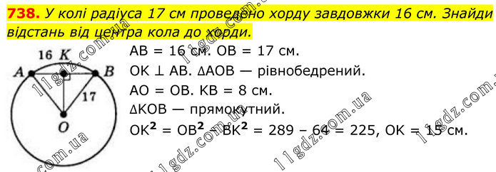 738. У колі радіуса 17 см проведено хорду завдовжки 16 см. Знайди відстань від центра кола до хорди. AB = 16 см. OB = 17 см. OK ⊥ AB. ∆AOB — рівнобедрений. AO = OB. KB = 8 см. ∆KOB — прямокутний. OK2 = OB2 – BK2 = 289 – 64 = 225, OK = 15 см.