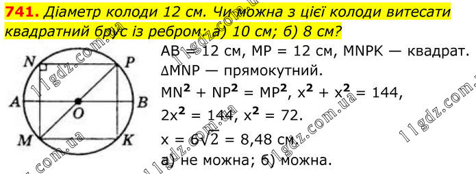 741. Діаметр колоди 12 см. Чи можна з цієї колоди витесати квадратний брус із ребром: а) 10 см; б) 8 см? AB = 12 см, MP = 12 см, MNPK — квадрат. ∆MNP — прямокутний. MN2 + NP2 = MP2, x2 + x2 = 144, 2х2 = 144, x2 = 72. х = 6√2 = 8,48 см. а) не можна; б) можна.