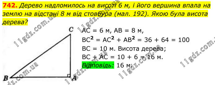742. Дерево надломилось на висоті 6 м, і його вершина впала на землю на відстані 8 м від стовбура (мал. 192). Якою була висота дерева? АС = 6 м, AB = 8 м, BC2 = AC2 + AB2 = 36 + 64 = 100. BC = 10 м. Висота дерева; ВС + AC = 10 + 6 = 16 м. Відповідь: 16 м.