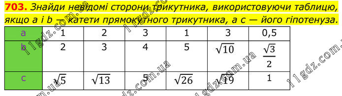 703. Знайди невідомі сторони трикутника, використовуючи таблицю, якщо a і b — катети прямокутного трикутника, а c — його гіпотенуза. a 1 2 3 1 3 0,5 b 2 3 4 5 √10 √3/2 c √5 √13 5 √26 √19 1