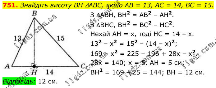 751. Знайдіть висоту BH ∆ABC, якщо AB = 13, AC = 14, BC = 15. З ∆ABH, BH2 = AB2 – AH2. З ∆BHC, BH2 = BC2 – HC2. Нехай АН = х, тоді HC = 14 – х. 132 – х2 = 152 – (14 – х)2; 169 – х2 = 225 – 196 + 28x – x2. 28х = 140; х = 5. AH = 5 cм; BH2 = 169 – 25 = 144; BH = 12 см. Відповідь: 12 см.