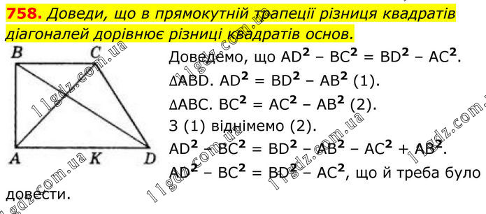 758. Доведи, що в прямокутній трапеції різниця квадратів діагоналей дорівнює різниці квадратів основ. Доведемо, що AD2 – BC2 = BD2 – AC2. ∆ABD. AD2 = BD2 – AB2 (1). ∆ABC. BC2 = AC2 – AB2 (2). З (1) віднімемо (2). AD2 – BC2 = BD2 – AB2 – AC2 + AB2. AD2 – BC2 = BD2 – AC2, що й треба було довести.