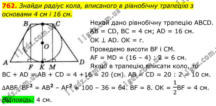 762. Знайди радіус кола, вписаного в рівнобічну трапецію з основами 4 см і 16 см. Нехай дано рівнобічну трапецію ABCD. AB = CD, BC = 4 см; AD = 16 см. OK ⊥ AD. OK = r. Проведемо висоти BF і CM. AF = MD = (16 – 4) : 2 = 6 см. Якщо в трапецію вписати коло, то BC + AD = AB + CD = 4 +16 = 20 (см). AB = CD = 20 : 2 = 10 см. ∆ABF. BF2 = AB2 – AF2 = 100 – 36 = 64. BF = 8. OK = 1/2BF = 4 см. Відповідь: 4 см.