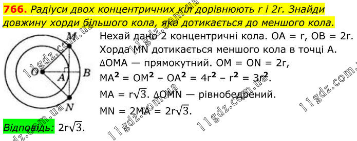 766. Радіуси двох концентричних кіл дорівнюють r і 2r. Знайди довжину хорди більшого кола, яка дотикається до меншого кола. Нехай дано 2 концентричні кола. OA = r, OB = 2r. Хорда MN дотикається меншого кола в точці А. ∆OMA — прямокутний. OM = ON = 2r, MA2 = OM2 – OA2 = 4r2 – r2 = Зr2. MA = r√3. ∆OMN — рівнобедрений. MN = 2МА = 2r√3. Відповідь: 2r√3.
