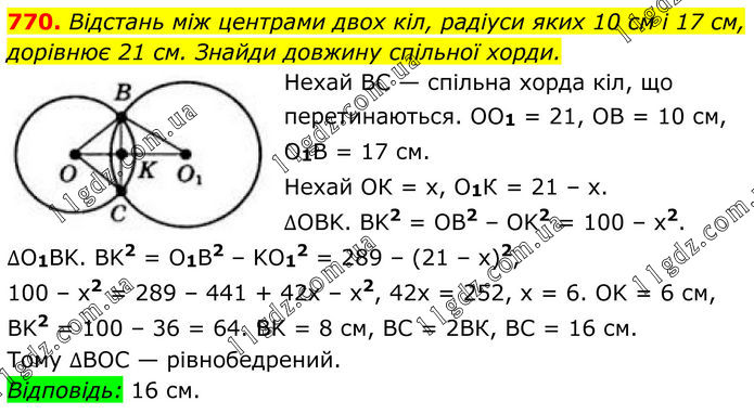 770. Відстань між центрами двох кіл, радіуси яких 10 см і 17 см, дорівнює 21 см. Знайди довжину спільної хорди. Нехай BC — спільна хорда кіл, що перетинаються. OO1 = 21, OB = 10 см, О1В = 17 см. Нехай ОК = х, О1К = 21 – х. ∆OBK. BK2 = OB2 – OK2 = 100 – х2. ∆O1BK. BK2 = O1B2 – KO12 = 289 – (21 – x)2, 100 – x2 = 289 – 441 + 42x – x2, 42x = 252, x = 6. OK = 6 см, BK2 = 100 – 36 = 64. BK = 8 см, ВС = 2ВК, ВС = 16 см. Тому ∆BOC — рівнобедрений. Відповідь: 16 см.
