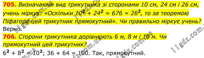 705. Визначаючи вид трикутника зі сторонами 10 см, 24 см і 26 см, учень міркує: «Оскільки 102 + 242 = 676 = 262, то за теоремою Піфагора цей трикутник прямокутний». Чи правильно міркує учень? Верно. 706. Сторони трикутника дорівнюють 6 м, 8 м і 10 м. Чи прямокутний цей трикутник? 62 + 82 = 102; 36 + 64 = 100. Так, прямокутний.
