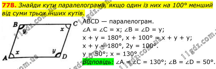 778. Знайди кути паралелограма, якщо один із них на 100° менший від суми трьох інших кутів. ABCD — паралелограм. ∠A = ∠C = x; ∠B = ∠D = y; x + y = 180°, х + 100° = х + у + у; х + у = 180°, 2у = 100°. у = 50°; х = 130°. Відповідь: ∠A = ∠C = 130°; ∠B = ∠D = 50°.