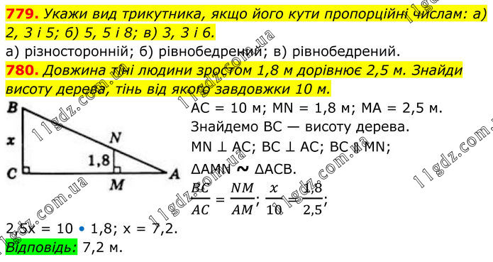 779. Укажи вид трикутника, якщо його кути пропорційні числам: а) 2, 3 і 5; б) 5, 5 і 8; в) 3, 3 і 6. а) різносторонній; б) рівнобедрений; в) рівнобедрений. 780. Довжина тіні людини зростом 1,8 м дорівнює 2,5 м. Знайди висоту дерева, тінь від якого завдовжки 10 м. AC = 10 м; MN = 1,8 м; MA = 2,5 м. Знайдемо BC — висоту дерева. MN ⊥ AC; ВС ⊥ AC; BC ∥ MN; ∆АМN ~ ∆АСВ. BC/AC = NM/AM; x/10 = 1,8/2,5; 2,5x = 10 • 1,8; х = 7,2. Відповідь: 7,2 м.