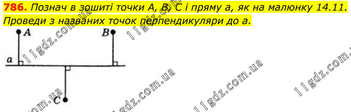 786. Познач в зошиті точки A, B, C і пряму a, як на малюнку 14.11. Проведи з названих точок перпендикуляри до a.