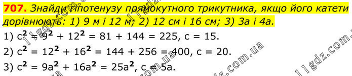 707. Знайди гіпотенузу прямокутного трикутника, якщо його катети дорівнюють: 1) 9 м і 12 м; 2) 12 см і 16 см; 3) 3a і 4a. 1) c2 = 92 + 122 = 81 + 144 = 225, c = 15. 2) c2 = 122 + 162 = 144 + 256 = 400, c = 20. 3) c2 = 9a2 + 16a2 = 25a2, c = 5a.